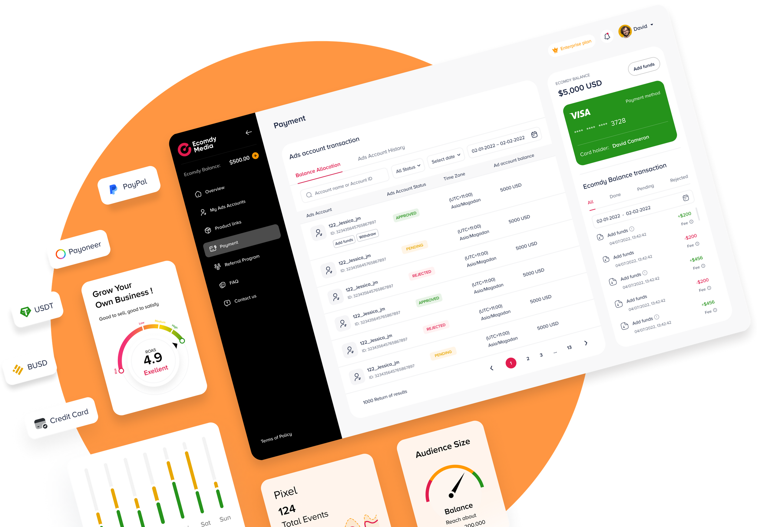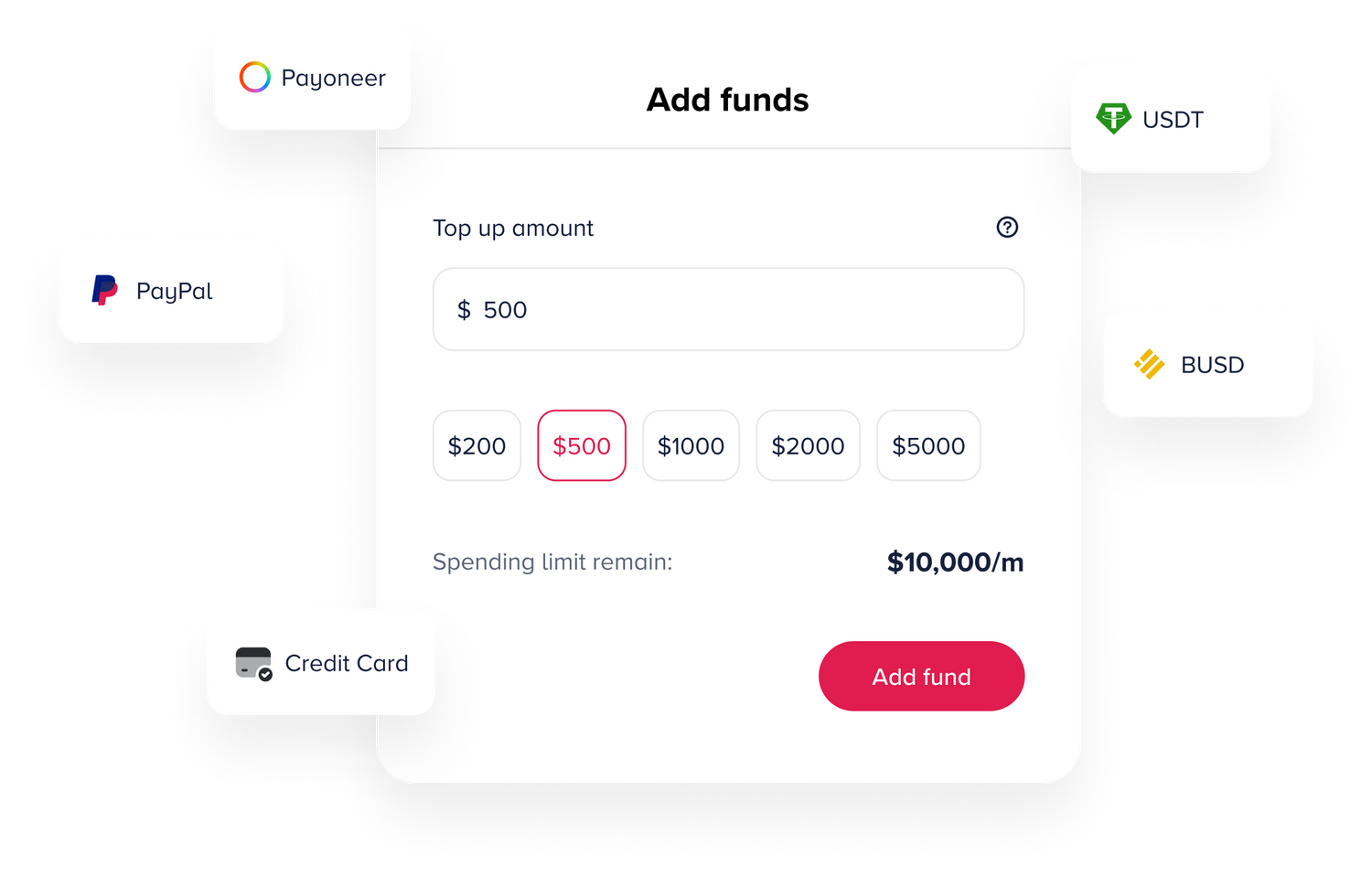 Top up and withdraw easily via multiple payment methods: Credit Card, Payoneer, PayPal, USDT and BUSD.